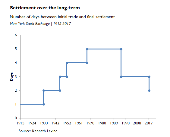 P.S. Here's a great article on the history of securities clearing and settlement: Was Trade Settlement Always on T+3? A History of Clearing and Settlement Changes, by Kenneth Levine (1996)